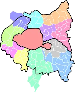| Gebied | Zetel | Aantal gemeenten | Gemeentebevolking[2] | Oppervlakte (km2) | Metropolitane raadsleden | Territoriale raadsleden | Voorzitter | |||
