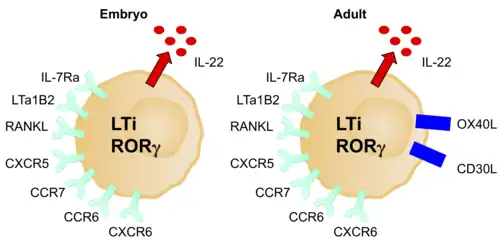 Hun productie wordt gestimuleerd door retinezuur, CXCL13, RANK-L en de cytokinen IL-1B, IL-23 en IL-6.[25] Ze brengen c-Kit, CCR6, CD25, CD127 en CD90 tot expressie, maar geen NCR's.[6] De expressie van OX40L is een andere goede marker voor LTi-cellen bij volwassen muizen en mensen.[23] Ze kunnen CD4+/- zijn. Net als ILC3's produceren LTi-cellen na activering voornamelijk IL-17A, IL-17F en IL-22.[23] Ze worden gemedieerd door RANK, TNF, IL-17 en IL-22.