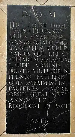 Hier ligt Dom Pierre Pérignon, van dit klooster gedurende zevenenveertig jaar keldermeester, die het wijnbeheer met de hoogste lof en met vele deugden heeft vervuld, vol van vaderlijke liefde, vooral voor de armen. Hij stierf op de leeftijd van 77 jaar in het jaar 1715. Moge hij rusten in vrede. Amen