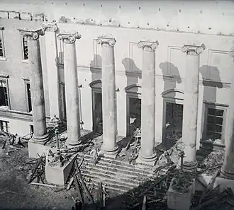 - Een hoge bordestrap leidt naar de ingangspartij, die in een portiek met rondboogstelling is geplaatst. Boven de middelste drie rondbogen bevindt zich op de verdieping een balkon net natuurstenen borstwering.