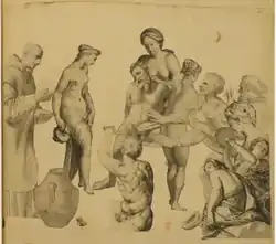 Adriaan Beverland tekent een standbeeld van Venus. Prent van Isaac Beckett.(1687)