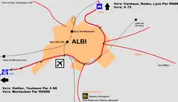 De onderstaande kaart toont de ligging van Albi met de belangrijkste infrastructuur en aangrenzende gemeenten.