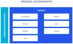 Deze administratie beschikt over een Centrale Component in Brussel en 10 buitendiensten (Antwerpen, Brugge, Gent, Zaventem, Genk, Brussel, Luik, Bierset, Bergen en Charleroi)