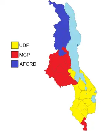 De presidentsverkiezingen werden gewonnen door Bakili Muluzi van het United Democratic Front. Hij was eerder lid geweest van de regering van president Banda en was geruime tijd leider van de MCP geweest. Pas in 1992 brak hij met de MCP en richtte hij het UDF op.[4] Muluzi versloeg zittend president Hastings Banda, aan de macht als president sinds 1966[1] (en van 1971 tot 1993 als "president voor het leven") met 47% van de stemmen. Banda bleef steken op 33%.