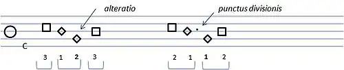 In het rechter voorbeeld is de situatie geheel anders. Er staat een punctus divisionis tussen beide semibreven. De punt geeft aan dat erachter een nieuwe perfectie begint. Dat wil zeggen dat de eerste semibrevis samen met de eerste brevis een perfectie vormt. De eerste brevis wordt dus door de semibrevis imperfect gemaakt en heeft slechts de waarde van twee semibreven. Hetzelfde geldt voor de laatste brevis.