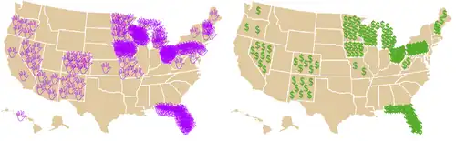 Vanwege het kiessysteem richtten de kandidaten hun aandacht voornamelijk op een relatief klein aantal swing states. Links staat aangegeven welke staten door de presidents- en vicepresidentskandidaten werden bezocht, rechts de staten waar de campagnegelden werden besteed.