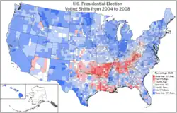 Gedurende de verkiezingsstrijd in 2008 werden ook deze staten zwaar bevochten, alsmede Pennsylvania en Ohio. Echter ook een aantal staten die Bush met gemak won in 2004 waren in 2008 binnen het bereik van Obama, met name Colorado, Virginia, Indiana, Missouri en North Carolina. Toen gedurende de avond van de verkiezingen de uitslagen van de genoemde staten, op Missouri na, allemaal ten gunste van Obama uitvielen, werd het duidelijk dat hij de verkiezingen ging winnen. In de dagen na de verkiezingen werd bekendgemaakt, dat Obama ook Indiana en North Carolina gewonnen had.