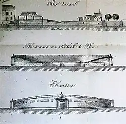 In 1828 noemde Jean-Louis Chalmel in zijn Histoire de Touraine het amfitheater zonder de plaats ervan aan te geven. Op een plattegrond van het castrum dat rond 1829 door Noël Champoiseau werd getekend, was de zuidelijke muur perfect rechthoekig, wat de auteur bevestigde in de tekst bij het plattegrond '[De muur] begon vanaf de toren die nog steeds op de binnenplaats van het aartsbisdom staat; hij bereikte in een rechte lijn die van de Cupido ...'.