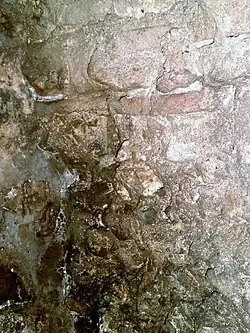 Bovenkant van een sokkel (gegoten kapiteel) en voetstuk van de boog.