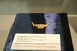 - ↑ D’Anastasio, R.; Wroe, S.; Tuniz, C.; Mancini, L. & Cesana, D.T. 2013. "Micro-biomechanics of the Kebara 2 hyoid and its implications for speech in Neanderthals". PLOS ONE. 8(12): e82261