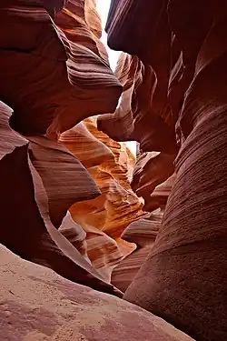 De Upper Antelope Canyon is zo'n 400 meter lang en 44,3 meter diep. Hier zijn bijzondere lichteffecten te zien, doordat op een aantal plaatsen de zonnestralen door smalle openingen naar binnen schijnen.