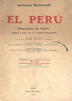 Gedurende zijn carrière toonde Raimondi interesse voor alles wat met Peru te maken had. Zo ondernam hij niet minder dan achttien uitgebreide tochten door de verschillende departementen van het land. Tijdens deze reizen bestudeerde hij zowel de geografie als de geologie, de flora, de fauna, de etnografie en de archeologie van Peru. In 1875 werd zijn grote werk El Perú gepubliceerd, waarin al zijn bevindingen gebundeld waren.