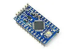 Arduino (pro-)micro. De arduino pro-micro is heel gelijkend aan de mini, maar gebruikt een ATmega32U4 microcontroller. Doordat er een micro-usb aansluiting gebruikt wordt kan je deze makkelijk aan je pc verbinden en programmeren. Door het gebruik van de ATmega32U4 chip kan deze arduino ook een muis en toetsenbord emuleren als deze is verbonden met een pc. Tot nu toe is dit de kleinste arduino.