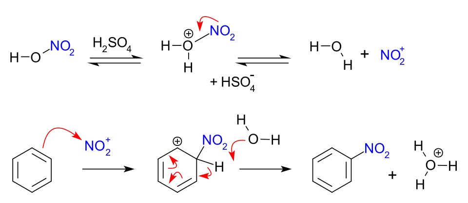 Als katalysator wordt doorgaans geconcentreerd zwavelzuur gebruikt omdat het niet alleen een sterker zuur is dan salpeterzuur maar ook omdat het sterk hygroscopisch is waardoor het water bij de reactie weg kan houden, aangezien dat ongewenste producten en ongewenste vertraging van de reactie op kan leveren. Het mengsel van zwavelzuur en salpeterzuur wordt nitreerzuur genoemd. Zwavelzuur reageert echter wel op zeer exotherme wijze met water en om te voorkomen dat het salpeterzuur door de hoge temperatuur begint te vervallen tot water en stikstofoxides moet de reactie gekoeld worden tot onder de 40°C.