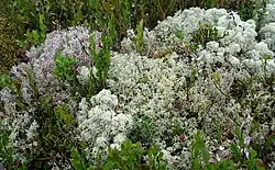 Tussen de dwergstruiken, en vooral op de iets vochtigere plaatsen, kan een goed ontwikkelde moslaag met overwegend bladmossen voorkomen.