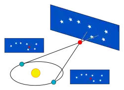De ster wordt dan vanuit twee verschillende posities waargenomen. Die twee posities zijn twee punten in de baan van de Aarde, bijvoorbeeld met zes maanden tussentijd. Op telescoopfoto's wordt dan vergeleken over welke hoek in boogseconden de plaats van de ster afwijkt ten opzichte van de vaste sterren die veel verder staan. Een ster heeft ook een eigenbeweging. Er zijn dan ook minstens drie waarnemingen nodig, steeds met een half jaar tussenruimte. Uit het verschil tussen de eerste en de derde waarneming (die idealiter op dezelfde dag van het jaar gemaakt zijn) blijkt de eigenbeweging, uit het verschil met de tweede waarneming de afstand. Een parallax van een boogseconde komt overeen met een afstand van een parsec ofwel 3,26 lichtjaar. De eerste parallax is gemeten in 1838 door Friedrich Bessel van de ster 61 Cygni.