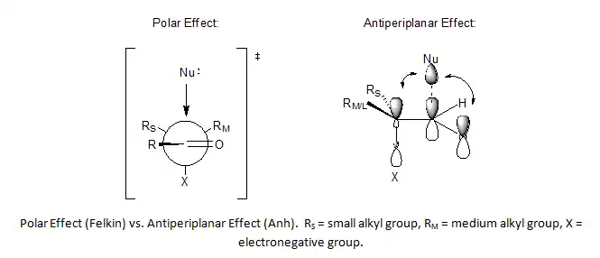 ![]() | Schema 5: Polair effect volgens Felkin tegenover het anti-periplanair effect volgens Ahn. | ||