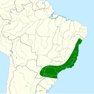De vogel komt voor in het oosten van Brazilië, doorlopend tot in oostelijk Paraguay en noordoostelijk Argentinië. De leefgebieden liggen in natuurlijk bossen tot op 1000 meter boven zeeniveau. Het is geen bedreigde vogelsoort.[1]