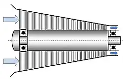 Het omzetten van snelheid in druk gebeurt in een diffusor, dat is een divergerend (= uitlopend) kanaal. Het principe van de diffusor berust op de (hier vereenvoudigde) Wet van Bernoulli, die stelt dat: