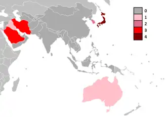 In de tabel een lijst van gastlanden en het resultaat van het betreffende land in het toernooi.