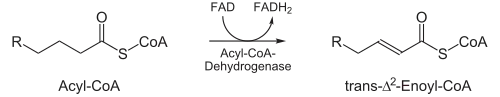 | Dehydrogenatie met FAD: De eerste stap is de oxidatie van het vetzuur door Acyl-CoA-dehydrogenase. Dit enzym katalyseert de vorming van een dubbele binding tussen C-2 en C-3. | ![]() | acyl CoA dehydrogenase | trans-Δ2-enoyl-CoA |