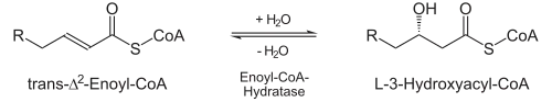 | Hydratatie: De volgende stap is de hydratatie van de binding tussen C-2 en C-3. Deze reactie is stereospecifiek en vormt enkel het L-isomeer | ![]() | enoyl CoA hydratase | L-β-hydroxyacyl CoA |