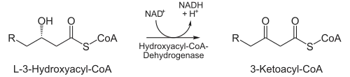 | Oxidatie door NAD+: De derde stap is de oxidatie van L-β-hydroxyacyl CoA door NAD+. Dit zet de hydroxylgroep om in een ketongroep. | ![]() | L-β-hydroxyacyl CoA dehydrogenase | β-ketoacyl CoA |