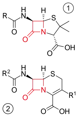 Bètalactam is de vierkante structuur in het midden van penicille resp. cefalosporine