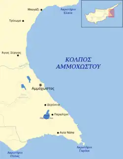 Dit artikel of een eerdere versie ervan is een (gedeeltelijke) vertaling van het artikel Κόλπος της Αμμόχωστου op de Griekstalige Wikipedia, dat onder de licentie Creative Commons Naamsvermelding/Gelijk delen valt. Zie de bewerkingsgeschiedenis aldaar.