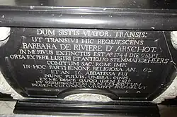 Op de cartouche van de tombe van het praalgraf verwees zij naar het met haar uitstervend geslacht van de Rivières met de volgende tekst: IN ME RIVUS EXTINCTUS EST A' 1744 DIE 9 SEPT of "In mij heeft de rivier van het leven een eind genomen". De gehele (vertaalde) tekst luidt als volgt: "Zolang je stilstaat, reiziger, beleef je hetgeen ik, Barbara de Rivière d'Arschot, die hier rust, beleefd heb. In mij is de «rivier» opgedroogd, in het jaar 1744, de negende dag van september. Ik ben geboren uit de vermaarde en oude stam van Heers, graven van het Heilig Roomse Rijk. In dit klooster ben ik tweeënzestig jaar zuster en zestien jaar abdis geweest. Nu ben ik stof, schaduw en as. Leer van mij dat je eenmaal dezelfde weg zult gaan en bid de levende koning, Onze Heer Jezus Christus, voor wie alles leeft, dat ik eeuwig in vrede moge rusten."