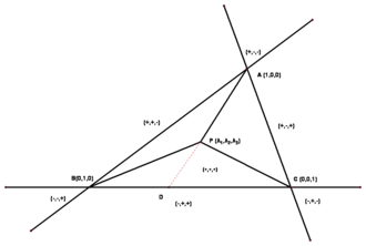 Hieruit volgt dat een lijn in barycentrische coördinaten en door is bepaald.