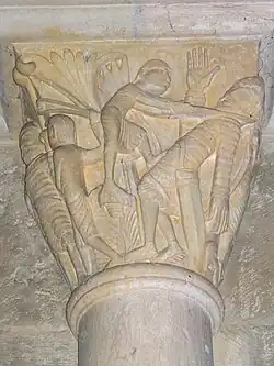 Een van de pijlers van de narthex met zijn 4 samengestelde zuilen. Het kapiteel beeldt uit Samson velt de leeuw.