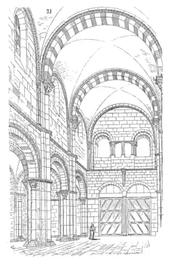 De narthex en zijn galerijen. Rechts gaat de zijgalerij met kleine rondbogen op zuiltjes over in het centrale deel van de narthex. Links : de centrale galerij, ook chapelle Saint-Michel genoemd.
