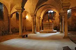 De tamelijk grote crypte (20 × 9 m) onder het koor stamt uit de Karolingische tijd. In de 12e eeuw vond een herinrichting plaats, in de 13e eeuw werd een plafondschildering aangebracht. De crypte wordt afgedekt door kruisgewelven die steunen op pilaren van ongelijke grootte. De ooit aanwezige relieken van Maria van Magdala zijn verdwenen. Op 23 juli 1876 werd een reliek van Maria van Magdala vanuit de Kathedraal van Sens overgebracht naar Vézelay. Deze handeling was het begin van een nieuwe pelgrimage naar Vézelay. Het reliek, een vingerbeentje, is te zien in de crypte in een nis die recht tegenover het altaar met het Christusbeeld ligt.