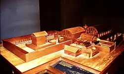 Tempel en Thermen gewijd aan de Romeinse beschermgodin Minerva. "In haar tempel zullen de eeuwige vlammen nooit wit worden tot as" (Solinus 3e eeuw na Chr.)19920402-Plattegrond Badcomplex met Heilige Bron te Bath .Foto GvAsdaenaOverloop Heilige Bronwater naar overige badenMaquette overdekt badcomplex te Bath. Uitvoering in hout.Fakkels ontstoken in het grote orakelbad te Bath