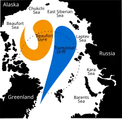 Tussen de gyre en Rusland stroomt de Transpolaire driftstroom van de Laptevzee en de Oost-Siberische Zee naar de Straat Fram tussen Groenland en Spitsbergen.