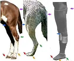 rood: hoef, pootnagel of teennagel; geel: bal; groen: hiel; blauw: kniegewricht; violet: heupgewricht