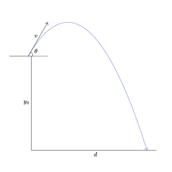 Uit de formule volgt dat bij een vlak terrein dus y0 = 0 het bereik d het grootst is voor een hoek θ = 45°.