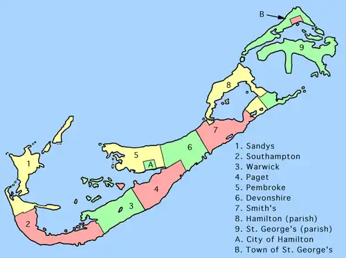 Bermuda is bestuurlijk onderverdeeld in twee gemeenten en negen parishes (letterlijk parochies). De parishes zijn een administratieve indeling, naar het lijkt zonder bevoegdheden.