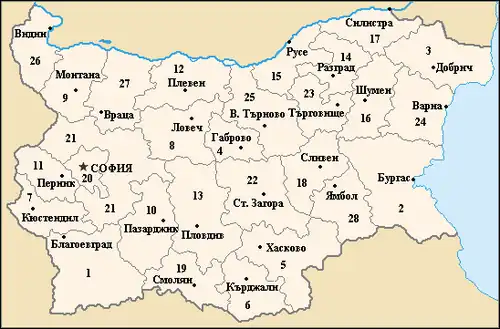 Sinds 1999 bestaat Bulgarije uit 28 oblasten of provincies (Bulgaars: области, oblasti; enkelvoud област, oblast), nadat het land sinds 1987 was onderverdeeld in negen grotere oblasten. Alle oblasten zijn vernoemd naar de regionale hoofdstad. De nationale hoofdstad, Sofia, vormt een eigen oblast.