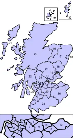 Strathclyde | Argyll and Bute, East Ayrshire, East Dunbartonshire, East Renfrewshire, City of Glasgow, Inverclyde, North Ayrshire, North Lanarkshire, Renfrewshire, South Ayrshire, South Lanarkshire en West Dunbartonshire |