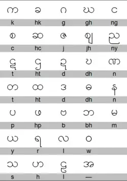 | 1010 | တ | ထ | ဒ | ဓ | န | ပ | ဖ | ဗ | ဘ | မ | ယ | ရ | လ | ဝ | သ | ဟ |