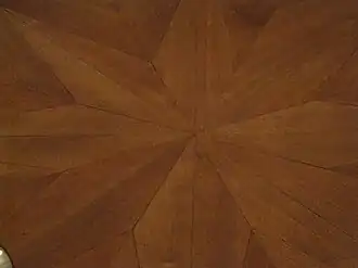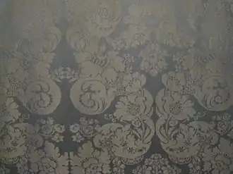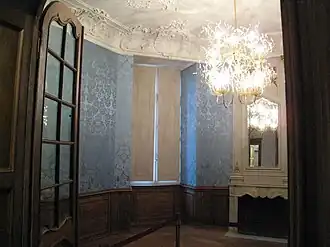 De wanden van het salon werden voorzien van blauwe zijde uit Lyon waarin een 18e-eeuws damastmotief verweven zit. De vloer voorzag men terug met een eiken parket in de oorspronkelijke stervormige configuratie. De zaalbetimmering in Luiks-Akense meubelstijl is oorspronkelijk.