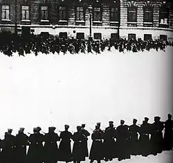 Ruim honderdduizend mensen deden aan de demonstratie mee en de massa werd geconfronteerd met wegversperringen op alle belangrijke toegangswegen: bij Mytninskaja, aan de Nevakade, op het Vasilevski-eiland. Toen de grootste stoet ter hoogte kwam van de imposante façade van de Narvapoort, gebouwd ter nagedachtenis aan Napoleons nederlaag, viel een eskader grenadiers te paard van het Garderegiment de menigte met getrokken sabel aan.