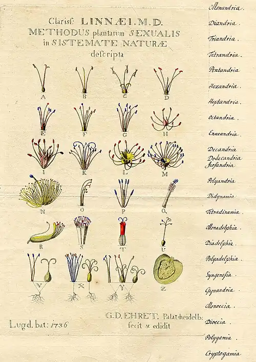 A: Monandria, B: Diandria, C: Triandria, D: Tetrandria, E: Pentandria, F: Hexandria, G: Heptandria, H: Octandria, I: Enneandria, K: Decandria, L: Dodecandria, M: Icosandria, N: Polyandria, O: Didynamia, P: Tetradynamia, Q: Monadelphia, R: Diadelphia, S: Polyadelphia, T: Syngenesia, U: Gynandria, V: Monoecia, X: Dioecia, Y: Polygamia, Z: Cryptogamia