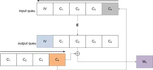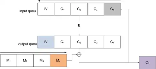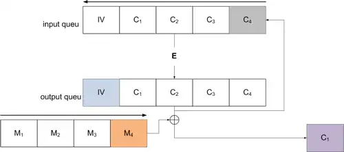 De IV wordt dus links geplaatst in de input queu (IV = C0), na versleuteling zal het meeste linkse deel van de output queu ge-XORed worden met het meest rechtse deel van de klare tekst. Na het toepassen van de XOR zal dit cijfertekst deel rechts toegevoegd worden aan de input queu. Hierna kan het volgende deeltje van de klare tekst verwerkt worden, dit proces zal zich herhalen totdat alle deeltjes van de klare tekst verwerkt zijn.