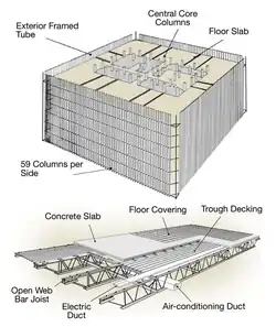 De stalen kolommen waren erg smal te noemen. 28 inches breed, ofwel 71 centimeter. Daartussen werden de betonnen vloeren verticaal en horizontaal ondersteund met 'floor trusses' tot aan het dak (de 'floor trusses' worden gezien als een belangrijke factor voor de instorting).[23]