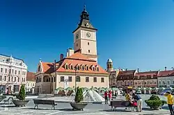 Vlak bij de kerk (in het hart van Brașov) is het marktplein Piața Sfatului met in het midden het 15e-eeuwse raadhuis.