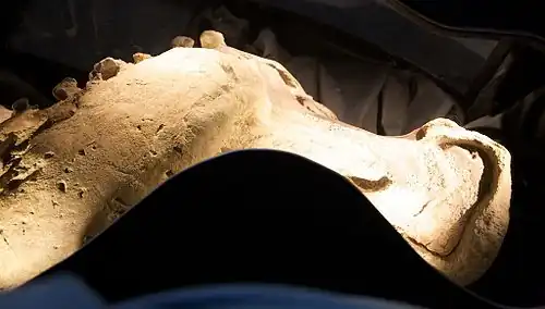 Door een fout bij de preparatie sloeg men per abuis bij de zevende en achtste rib door het oppervlak van de 'mummie' heen. Op deze positie, overeenkomend met de maag, bleken nog houtachtige plantenresten aanwezig.
