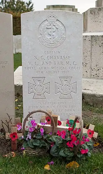 - Noel Chavasse (VC and Bar, MC), kapitein bij het Royal Army Medical Corps is een van de drie militairen die tweemaal werden onderscheiden met het Victoria Cross (VC). Hij ontving ook het Military Cross (MC) en overleed in een veldhospitaal in Brandhoek op 4 augustus 1917.
